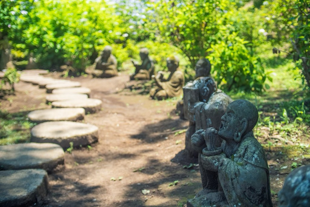 そしてこのお寺のもう一つの特徴は様々なカタチをした羅漢様。境内に広がる紫陽花の中に埋もれる様に、笑っていたり、眠っていたり、さらには読書、将棋、パソコン、スマホ…(入口近くに注射器を掲げ持つ羅漢様がいたのはCOVID-19の影響?)